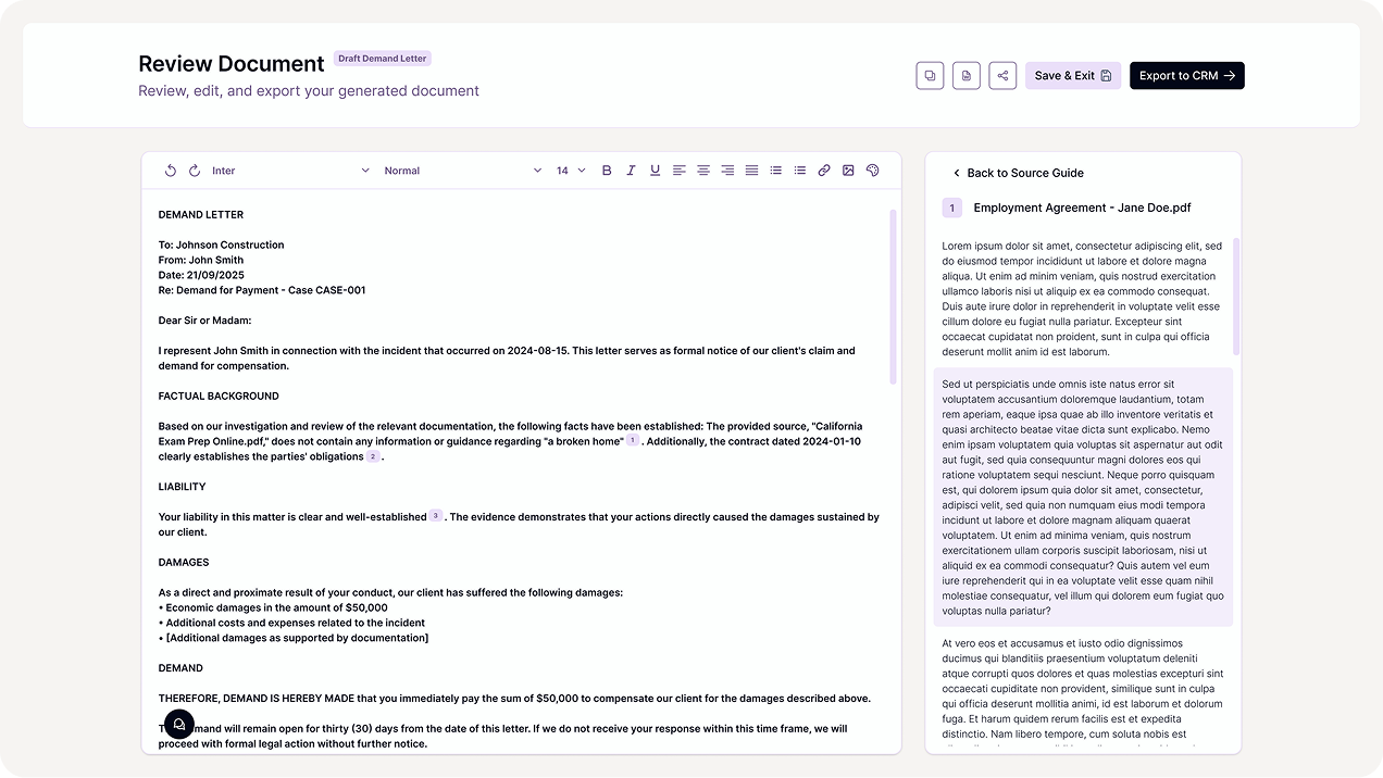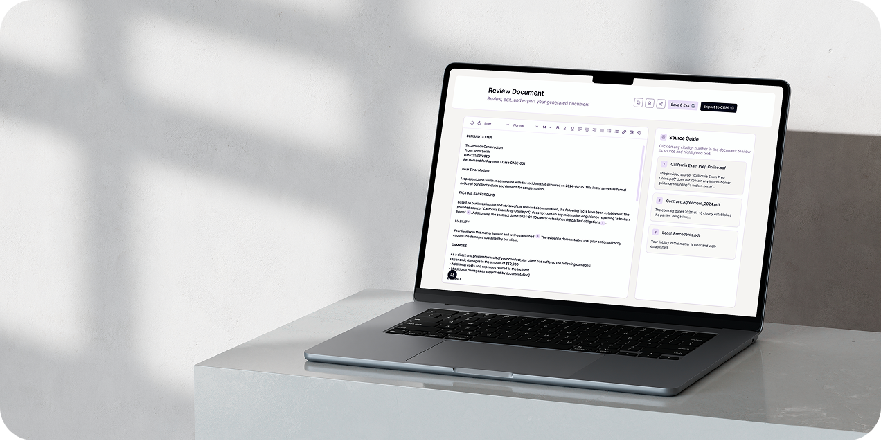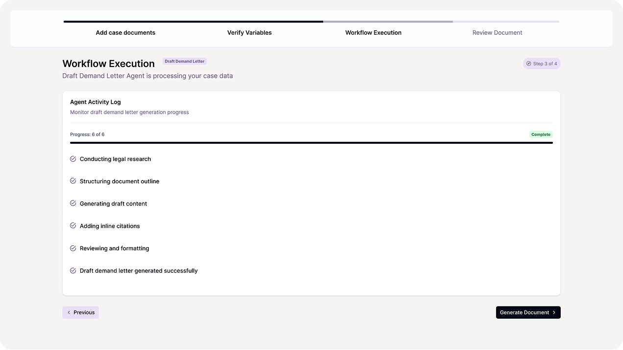 Streamline discovery prep, draft demand letters, and assess risk with agents trained on firm precedent.